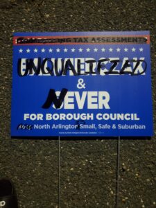 NORTH ARLINGTON – With supporters of the GOP incumbents now destroying the signs of local Democrats, how low will some go to intimidate those who believe in competitive elections and a grass roots democracy?