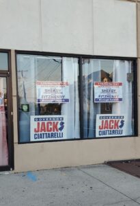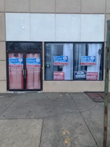 The space now appears vacant with political signs removed from the windows.