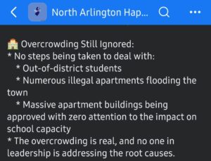 Overdevelopment in North Arlington is real and multifaceted, stretching from parking and traffic problems to higher taxes. The root causes lie in zoning decisions, political priorities, and developer activity, with the Mayor & Council and the Planning Board primarily held accountable. Residents are pushing for greater balance — smarter growth that respects community capacity and character. Until is done, this unbridled will affect current school enrollments and thus increase school taxes!